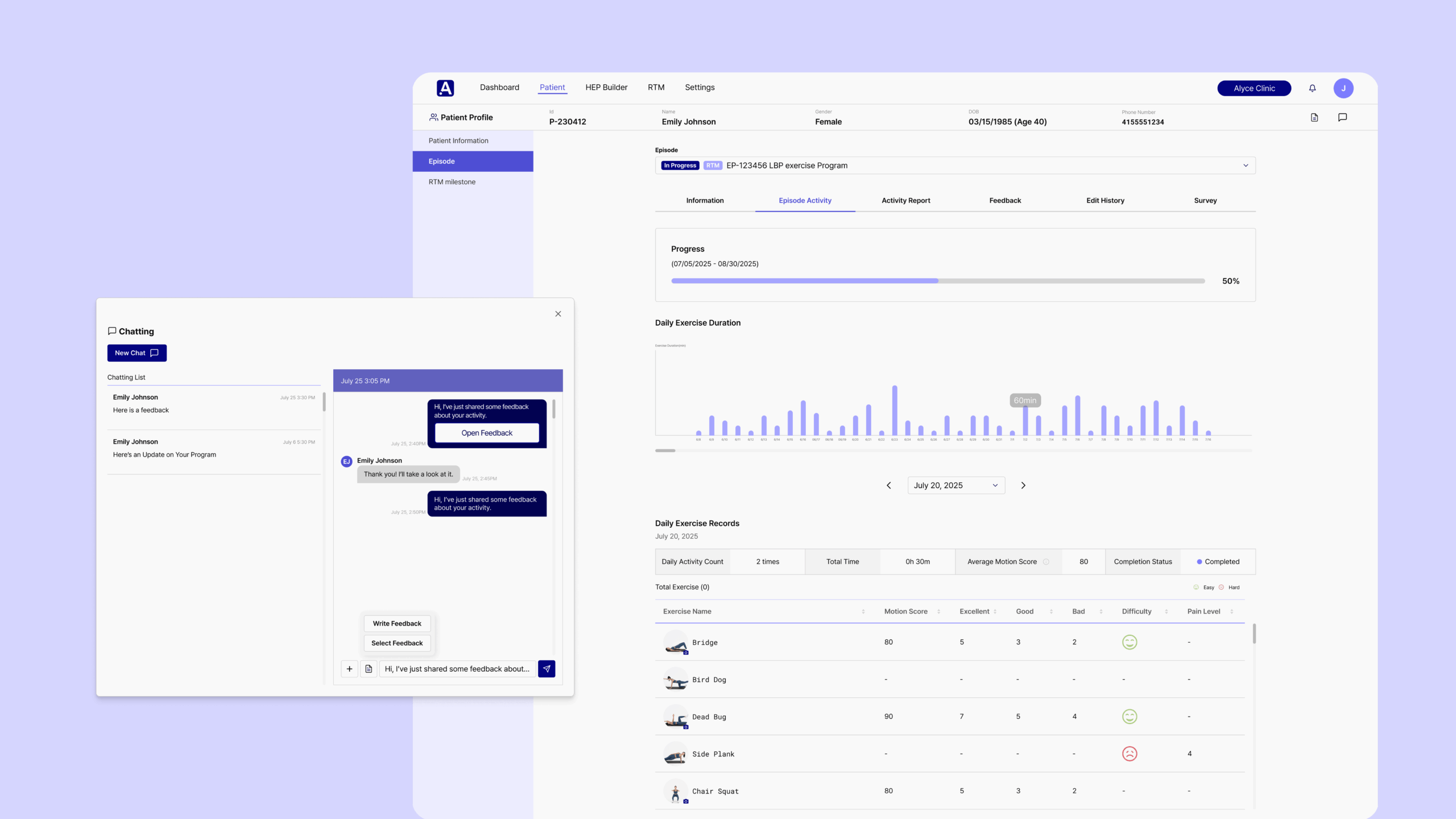 Assign exercises and invite patients with a simple link. Our intuitive dashboard makes patient onboarding seamless with comprehensive data management and mobile accessibility.